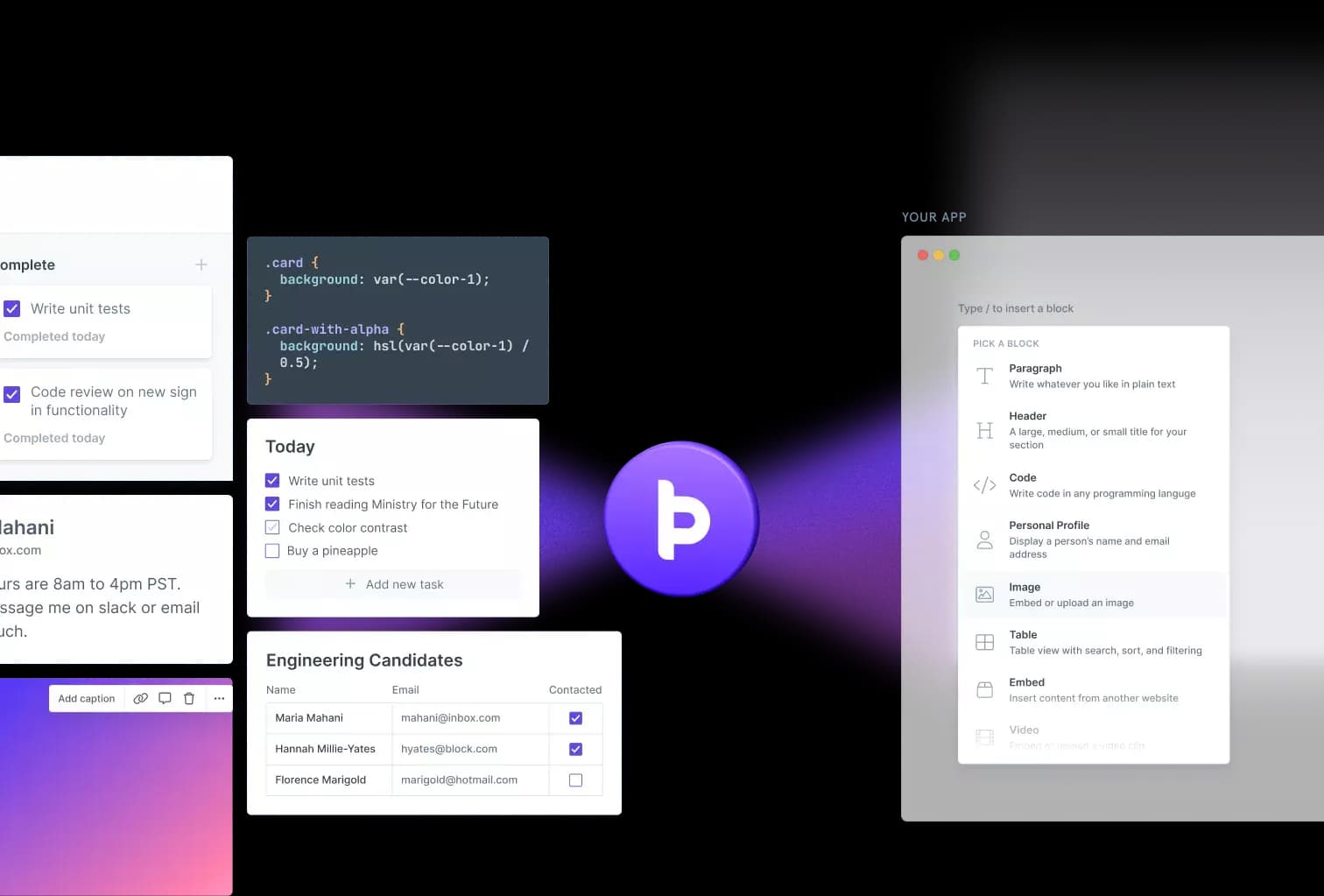 Users select the type of block they want, then add it to their page, dashboard, or canvas. They can add content to the block, edit it, or manipulate it to do what they need.